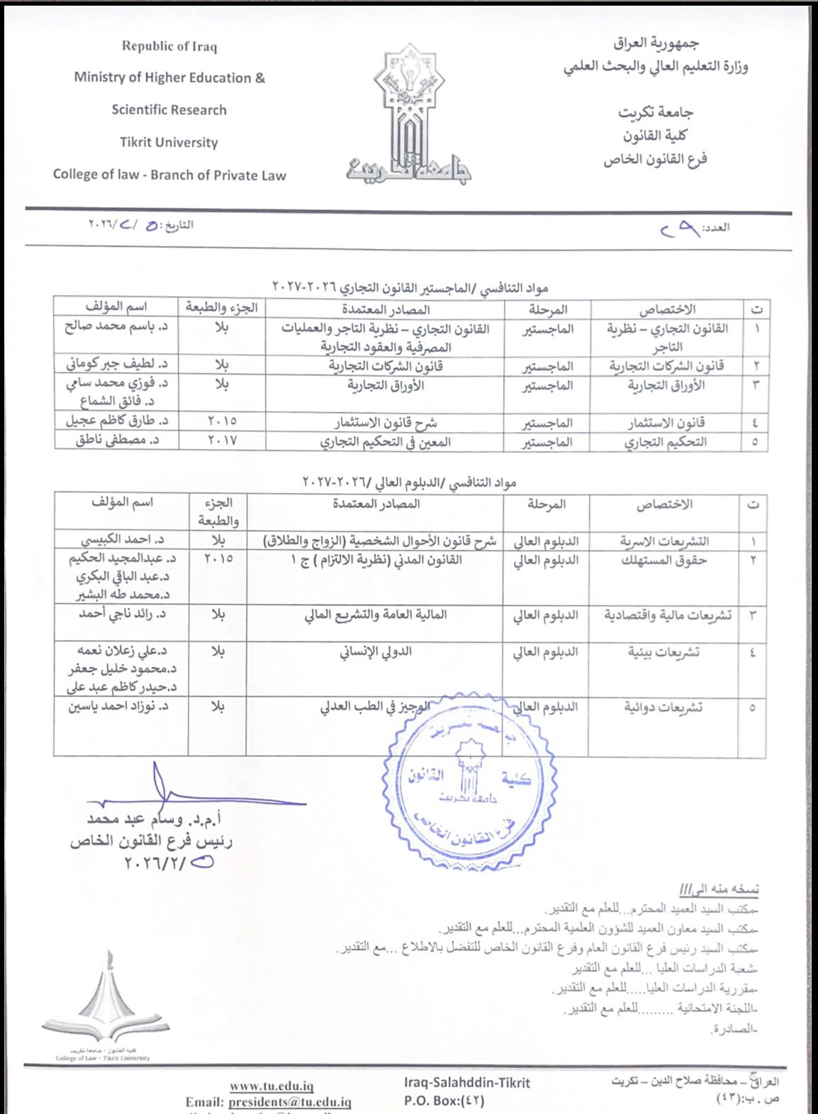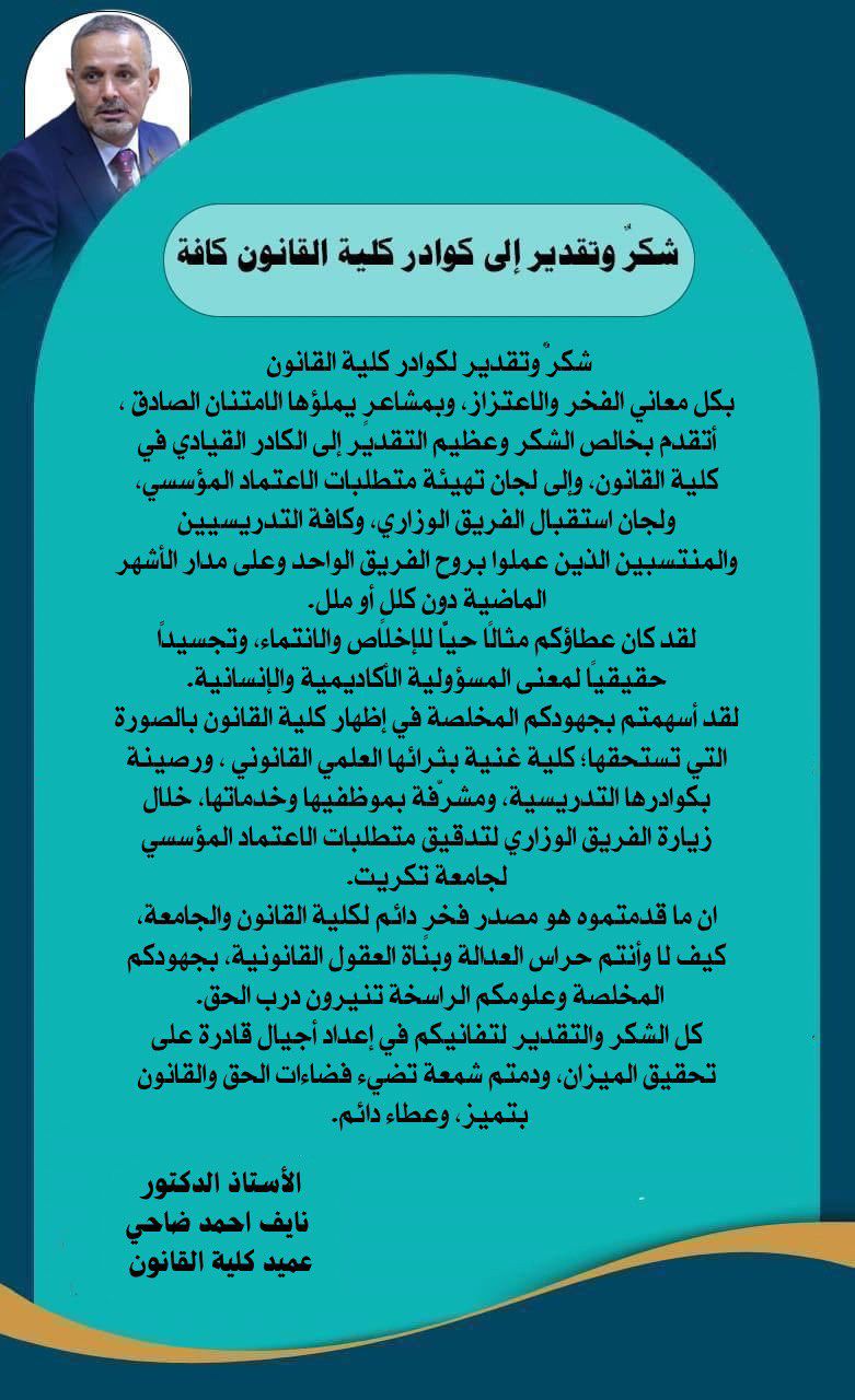 - تطوير مخرجات الكلية علمياً وادارياً بما يخدم سوق العمل وسوح القضاء.