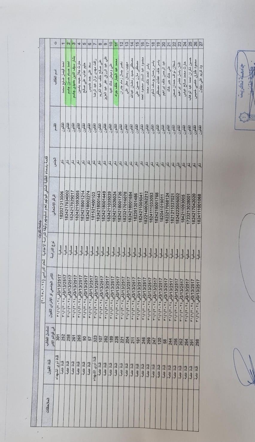 استنادا الى كتاب وزارة التعليم العالي/ دائرة الدراسات والتخطيط والمتابعة ذي العدد ت م ٥ / ١١س /٤٤٧٠ في ١٥ /١٢/ ٢٠٢٥ على الراغبين بالعودة إلى مقاعد الدراسة من الطلبة الملغي قبولهم للعام الدراسي ٢٠٢٤-٢٠٢٥ لعدم تسليمهم وثيقة الدراسة الاعدادية والواردة أسماؤهم في الجداول أدناه مراجعة شعبة التسجيل مستصحبين وثيقة الدراسة الاعدادية الاصلية معنونة إلى كلية القانون / جامعة تكريت وخلال موعد اسبوع من تأريخ نشر الإعلان.