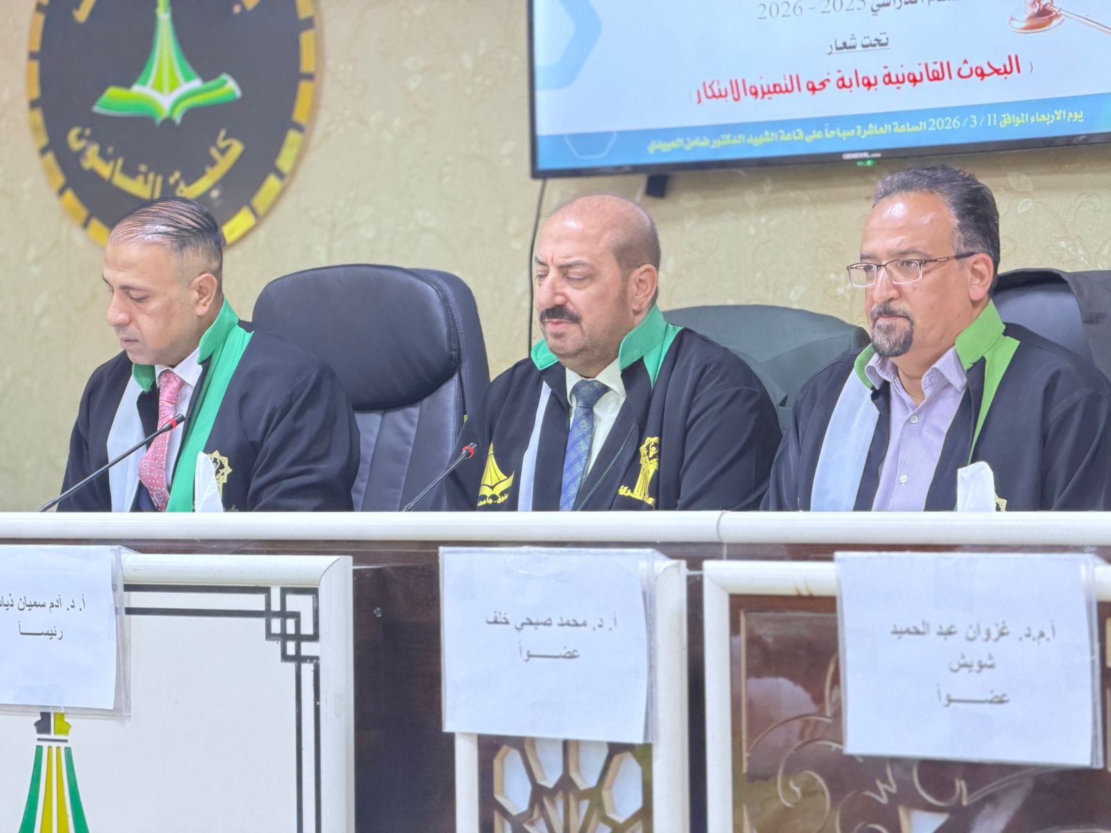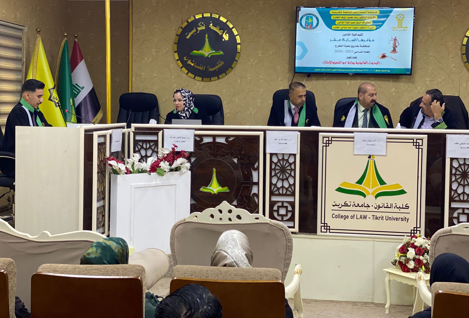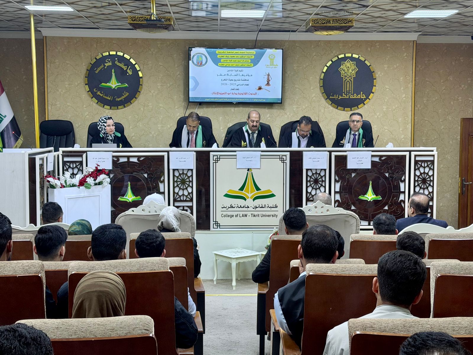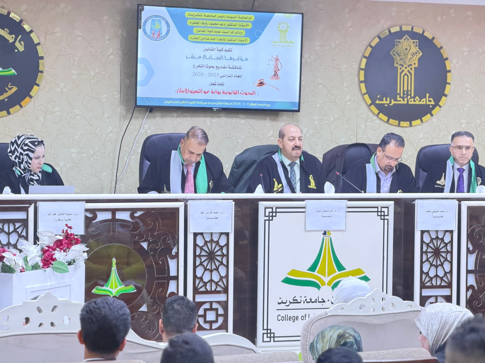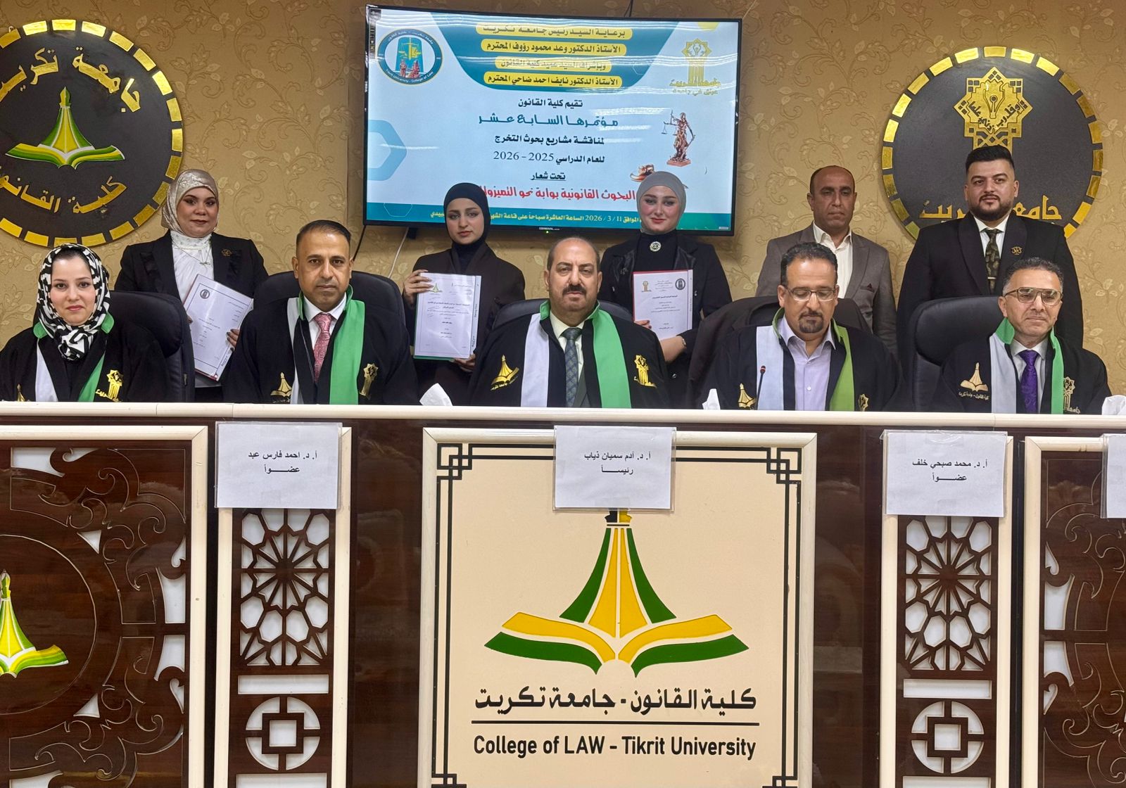 برعاية السيد رئيس جامعة تكريت الاستاذ الدكتور وعد محمود رؤوف ، وبأشراف السيد عميد كلية القانون الاستاذ الدكتور نايف احمد ضاحي، أقامت كلية القانون المؤتمر السابع عشر لمناقشة مشاريع بحوث التخرج لطلبة المرحلة الرابعة للعام الدراسي (2025–2026).