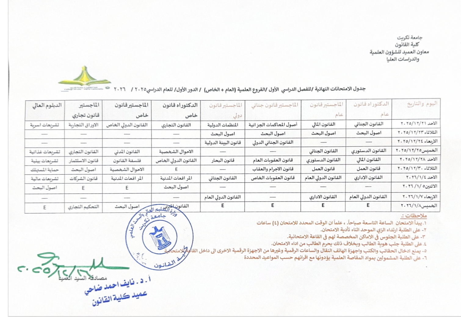 جدول امتحانات الدراسات العليا للعام الدراسي ٢٠٢٥-٢٠٢٦.