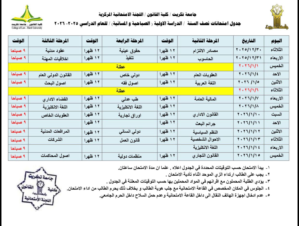 جدول امتحانات نصف السنة للدراسات الاولية ( الصباحي + المسائي ) للعام الدراسي 2025-2026