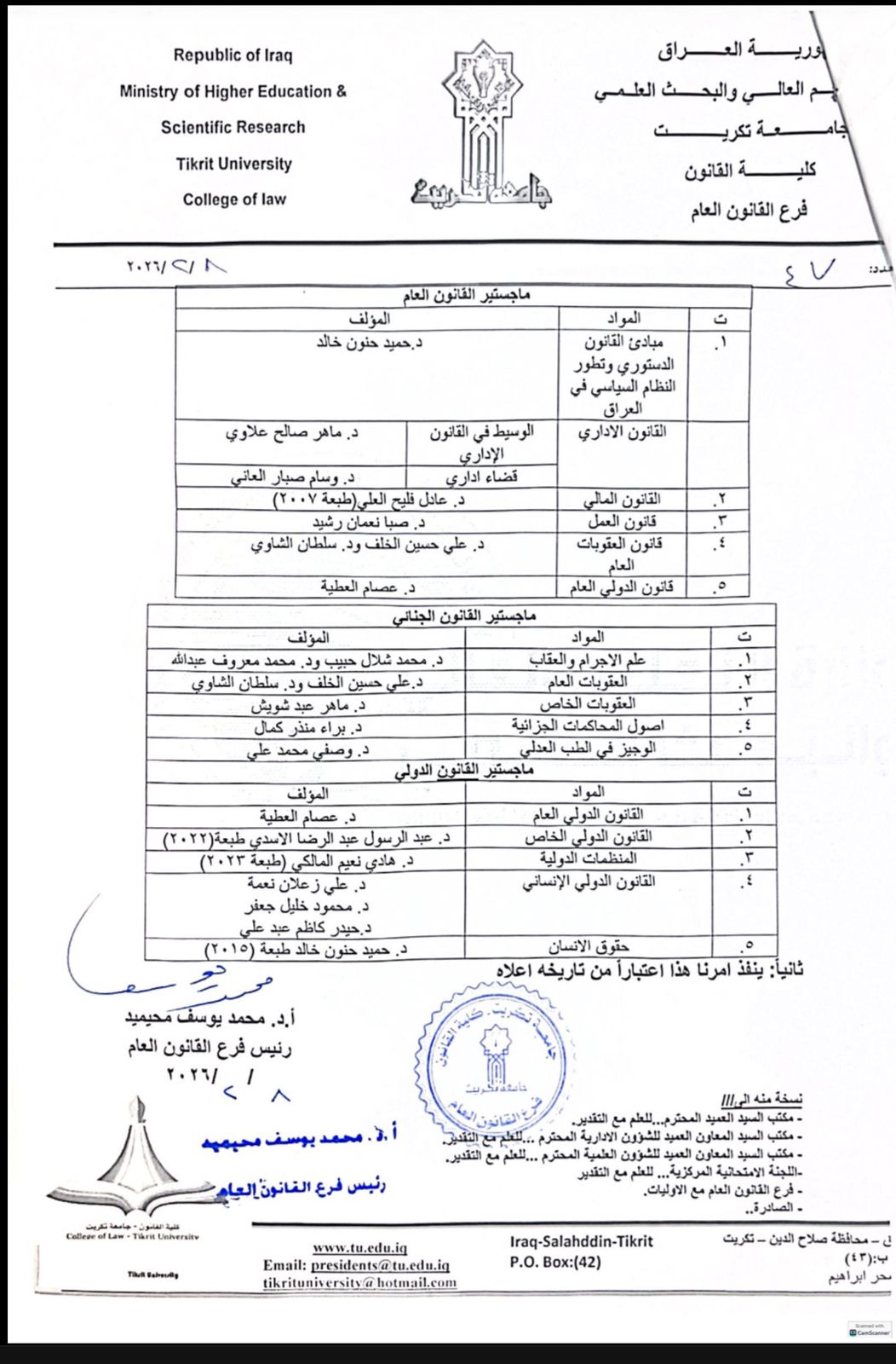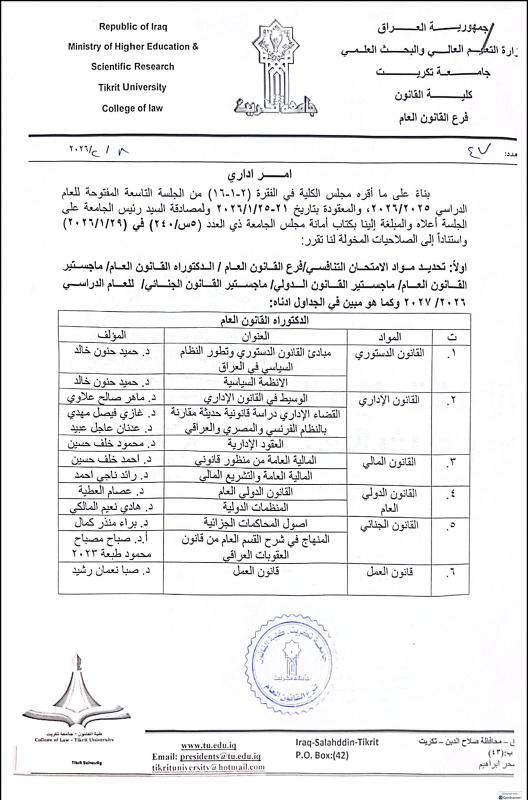 مواد الامتحان التنافسي للمتقدمين للدراسات العليا لفرعي القانون العام والخاص في كلية القانون -جامعة تكريت للعام الدراسي 2026-2027