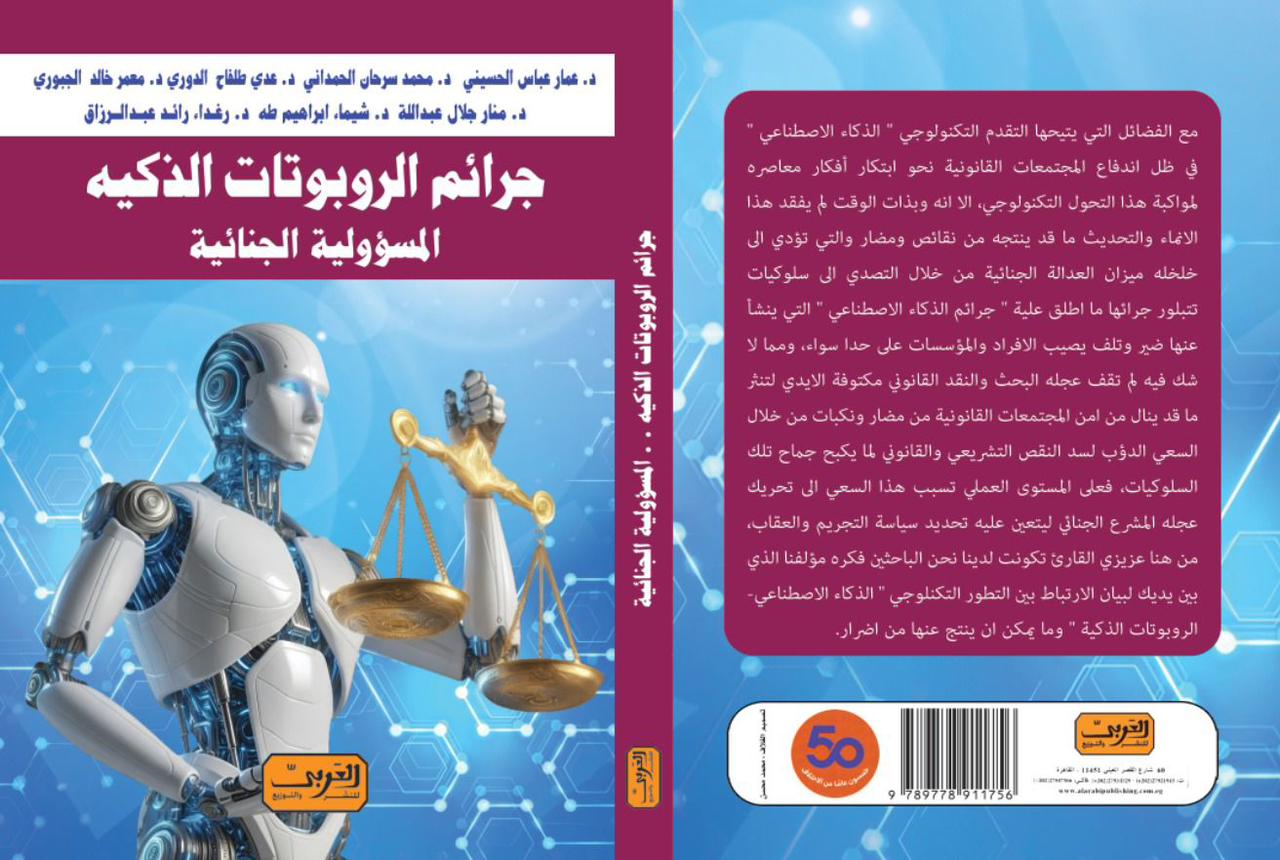 كتابًا علميًا بعنوان (جرائم الروبوتات الذكية المسؤولية الجنائية)، مع الفضائل التي يتيحها التقدم التكنولوجي " الذكاء الاصطناعي " في ظل اندفاع المجتمعات القانونية نحو ابتكار أفكار معاصره لمواكبة هذا التحول التكنولوجي، الا انه وبذات الوقت لم يفقد هذا الانماء والتحديث ما قد ينتجه من نقائص ومضار والتي تؤدي الى خلخله ميزان العدالة الجنائية من خلال التصدي الى سلوكيات تتبلور جرائها ما اطلق علية " جرائم الذكاء الاصطناعي " التي ينشأ عنها ضير وتلف يصيب الافراد والمؤسسات على حدا سواء، ومما لا شك فيه لم تقف عجله البحث والنقد القانوني مكتوفة الايدي لتنثر ما قد ينال من امن المجتمعات القانونية من مضار ونكبات من خلال السعي الدؤب لسد النقص التشريعي والقانوني لما يكبح جماح تلك السلوكيات، فعلى المستوى العملي تسبب هذا السعي الى تحريك عجله المشرع الجناني ليتعين عليه تحديد سياسة التجريم والعقاب، من هنا عزيزي القارئ تكونت لدينا نحن الباحثين فكره مؤلفنا الذي بين يديك لبيان الارتباط بين التطور التكنلوجي " الذكاء الاصطناعي-الروبوتات الذكية " وما يمكن ان ينتج عنها من اضرار.