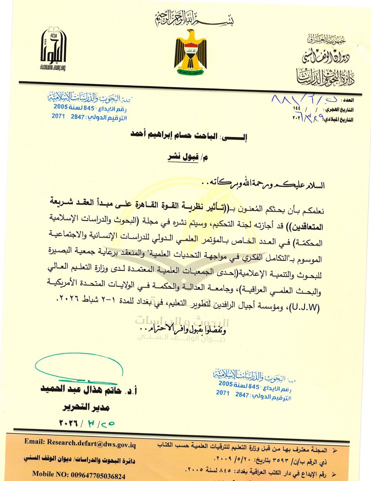 نشر الطالب حسام إبراهيم أحمد آل شامان السامرائي، من المرحلة الرابعة /الدراسة المسائية في كلية القانون - جامعة تكريت، بحثًا علميًا بعنوان: ( تأثير نظرية القوة القاهرة على مبدأ العقد شريعة المتعاقدين ) في مجلة البحوث والدراسات الإسلامية والإنسانية، إحدى المجلات العلمية المعتمدة لدى وزارة التعليم العالي والبحث العلمي ،في العدد الخاص بواقع المؤتمر العلمي الدولي1-2-2026 ،الذي شغل الصفحات من ( 220-240 )، وتناول البحث موضوعًا مهمًا في نطاق القانون المدني، حيث بحث في أثر القوة القاهرة والظروف الاستثنائية على الالتزامات التعاقدية، ومدى تأثيرها على مبدأ “العقد شريعة المتعاقدين”، بما يسهم في تحقيق التوازن بين استقرار المعاملات وتحقيق العدالة.هذا وقد حصل الطالب على شهادة شكر وتقدير ووسام الابداع والتمييز من المؤتمر العلمي الدولي للعلوم الانسانية والاجتماعية لسنة 2026