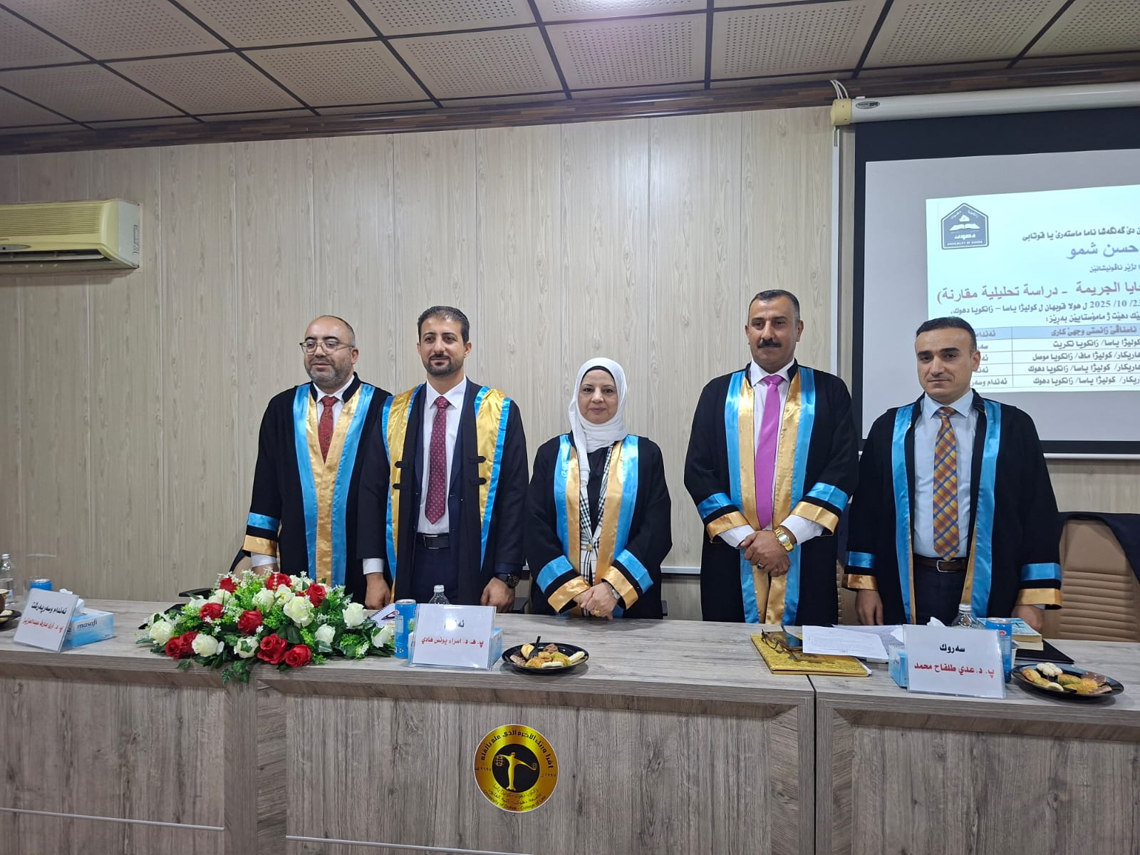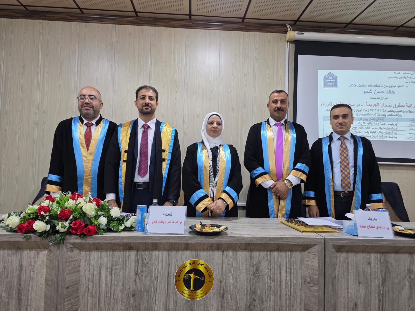 ترأس الأستاذ الدكتور عدي طلفاح محمد هذا اليوم المصادف 23/ 10/ 2025 مناقشة رسالة الماجستير الموسومة (الحماية الإجرائية لحقوق ضحايا الجريمة) للطالب (خالد حسن شمو) وذلك في كلية القانون بجامعة دهوك.